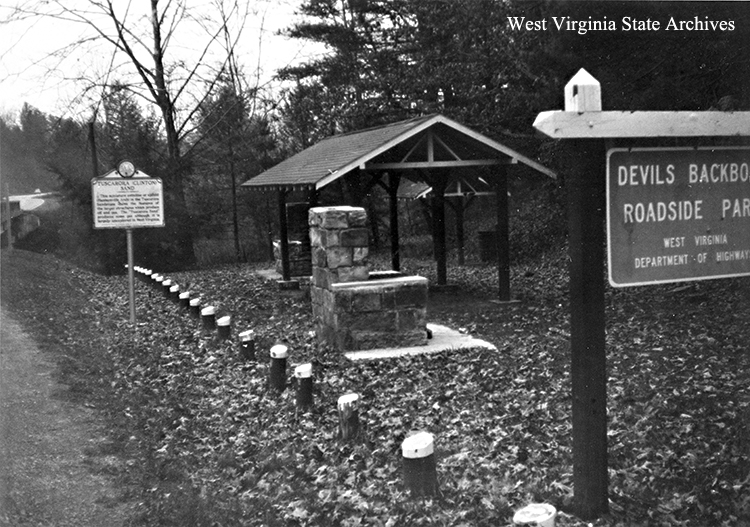 Devil's Backbone roadside park, district 8, with Tuscarora (Clinton) sand historic highway marker, Pocahontas County. Division of Highways Collection, West Virginia State Archives (336702)